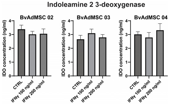 Indoleamine 2,3-dioxygenase is an immunosuppressant enzyme secreted by MSCs. IDO is a cytoplasmic protein responsible for converting tryptophan into N-formyl-kynurenine, which suppresses the proliferation of T-cells [15]. MSCs are routinely investigated for their functional features as a measure of their efficacy and potency. IDO secretion is indicative of MSC ability for immunomodulation. We assessed BvAdMSCs for secretion of IDO to evaluate their immunosuppressive abilities. At 70–80% confluency, BvAdMSCs were treated with IFN-γ. In BvAdMSC03, we noticed an increase in IDO secretion with 100 ng/mL of IFN-γ; however, the increases were not significant. We observed that BvAdMSCs, even without stimulation, secreted substantial amounts of IDO without any significant differences upon stimulation with IFN-γ (Figure 6). This implies that naïve adipose MSCs are capable of immunomodulation, even without external stimulus. Together, our results suggest the functional potency of BvAdMSCs in mediating immunomodulatory functions.