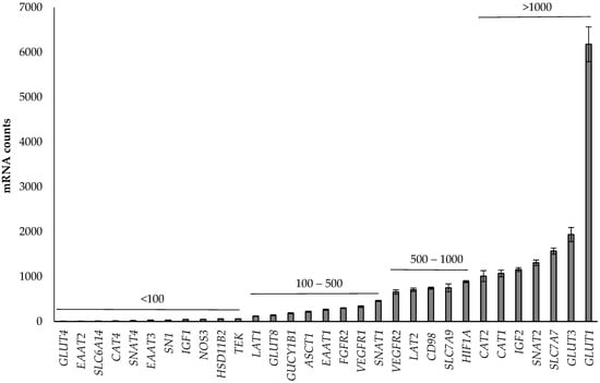 Overall, gene expression of the 31 genes evaluated varied considerably, with GLUT1 being the most abundant and GLUT4 the least abundant in the placentas (Figure 1).