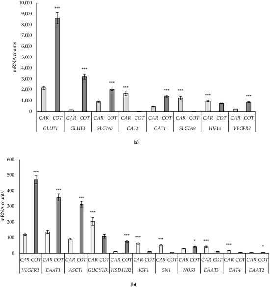 Effect of ovine tissue type (caruncle versus cotyledon) on expression of genes with mRNA counts with high (a) and low abundance (b). Data are presented as mean mRNA counts ± SE. Asterisks indicate differences between groups (* p < 0.05 and *** p < 0.001).