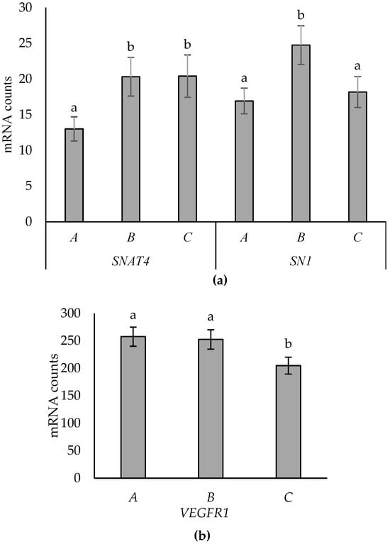 Effects of placentome subtype (A versus B versus C) on the expression of SNAT4 (p = 0.015; a), SN1 (p = 0.028; (a)), and VEGFR1 (p = 0.049; (b)). Data are presented as mean mRNA counts ± SE. Superscripts with different letters indicate differences between subtypes.