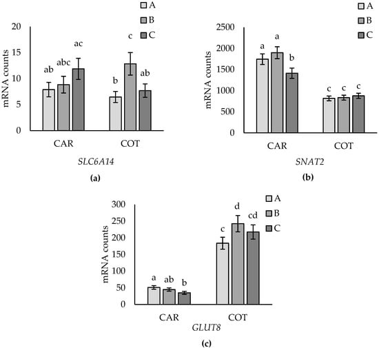 Placentome subtype (A versus B versus C) by tissue (caruncle (CAR) versus cotyledon (COT)) interaction for SLC6A14 (p = 0.045) (a), SNAT2 (p = 0.022) (b), and GLUT8 (p = 0.026) (c). Data are presented as mean mRNA counts ± SE. Superscripts with different letters indicate differences between subtypes and tissues.
