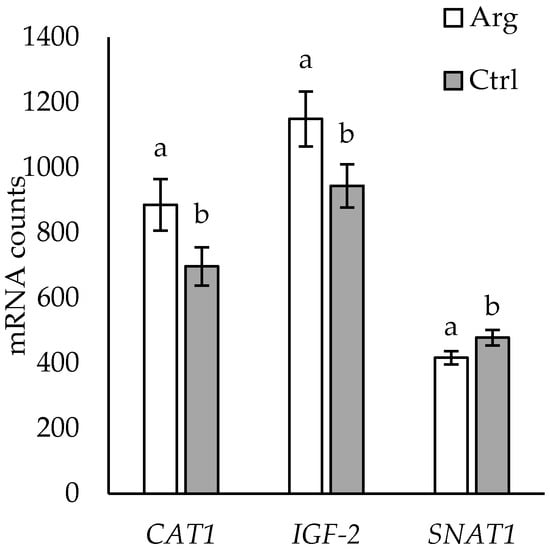 Overall supplementation (arginine (Arg) versus control (Ctrl)) effects for CAT1 (p = 0.044), SNAT1 (p = 0.030), and IGF2 (p = 0.046) in placentomes of twin-bearing ewes. Data are presented as mean mRNA counts ± SE. Superscripts with different letters indicate differences between Arg and Ctrl placentome treatments.