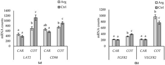 Tissue (caruncle (CAR) versus cotyledon (COT)) and supplementation (arginine (Arg) versus control (Ctrl)) interaction for LAT2 (p < 0.001; (a)) and CD98 (p = 0.003; (a)), and FGFR2 (p = 0.020; (b)) and VEGFR2 (p = 0.001; (b)). Data are presented as mean mRNA counts ± SD. Superscripts with different letters indicate differences between Arg and Ctrl treatments.