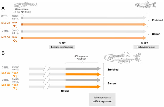 Overview of the experimental design. In Experiment 1 (A) wildtype (A,B) zebrafish were exposed via water to MIX G1 (100X, i.e., 100 times higher than the geometric mean of the serum levels in the pregnant women) or vehicle control (CTRL) for a total of 48 h between 72–120 hpf and thereafter reared in an enriched environment or in a barren environment. The effect on three locomotion endpoints was tested after 1 month using an automatic tracking system, and juvenile behaviour was assessed after 3 months by filming and manual scoring. In Experiment 2 (B), adult zebrafish raised with or without enrichment were exposed to MIX G0 (100X) or CTRL for 48 h and thereafter tested for effects on adult behaviour by filming and manual scoring. In addition, mRNA expression was analysed in adult liver samples.