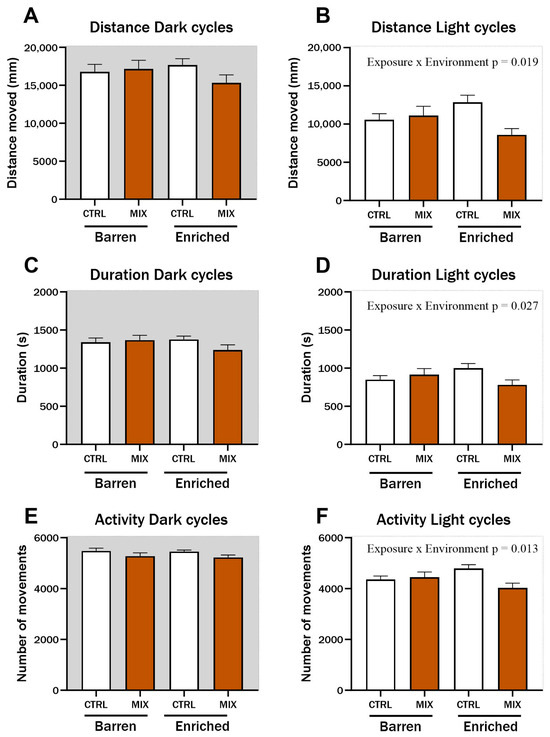 One month after acute exposure to MIX G1 in Experiment 1, zebrafish locomotion was assessed using a protocol of alternating dark and light cycles to stimulate locomotion. During light cycles, significant interaction effects between exposure and environment were observed for distance travelled (F = 5.62, p = 0.019) (Figure 3B), duration of movements (F = 4.98, p = 0.027) (Figure 3D), and swimming activity (F = 6.33, p = 0.013) (Figure 3F). Distance, duration, and activity were all lower in MIX-exposed fish from the EE compared to CTRL fish from the EE group during light cycles, while there was no difference between MIX and CTRL-exposed fish raised in the barren environment. No significant differences were observed during dark cycles for any of the tested endpoints (Figure 3A,C,E).