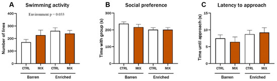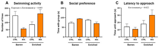 Three months after exposure in Experiment 1, three endpoints of juvenile zebrafish behaviour were assessed based on digital recordings of experimental fish. There was a significant main effect of environment on swimming activity (F = 4.68, p = 0.033), and enriched control fish swam significantly more compared to the control fish from the barren environment (p = 0.029) (Figure 4A). No main effects or significant interactions were observed for the social preference or for the latency to approach the group after three months (Figure 4B,C).