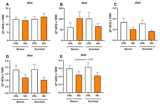 RT-qPCR results for relative hepatic mRNA expression levels of (A–C) deiodinases (dio1, dio2 and dio3) and (D,E) thyroid receptors (thra and thrb) in adult zebrafish exposed to MIX G0. D. rerio raised in barren or enriched tanks were exposed to MIX G0 or CTRL solution for 48 h and RT-qPCR was performed on liver samples (8–9 n per concentration). Results are presented as mean ± standard error for (2−dCt) × 1000. Statistically significant main effect (exposure = MIX or CTRL) is shown by p-value.