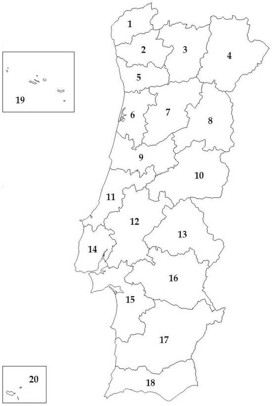 Districts of Portugal, continental and insular, included in this study. The numbers correspond to the districts listed in Table 1.