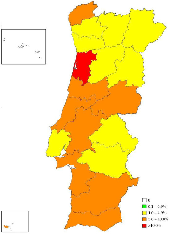 Prevalence map for D. immitis in domestic dogs in continental and insular Portugal by districts. In the Aveiro district (depicted in red), the white area represents Aveiro’s Ria.
