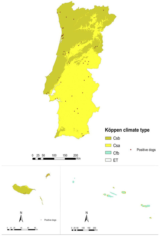 The distribution of various climates across Portugal and the location of positive dogs can be observed in Figure 3. The statistical analysis revealed no significant differences between climates, although the lowest prevalence was consistently observed in districts with a Csb climate classification. Additionally, the Azores exhibited a prevalence of zero, representing the only district characterised by a Cfb climate.