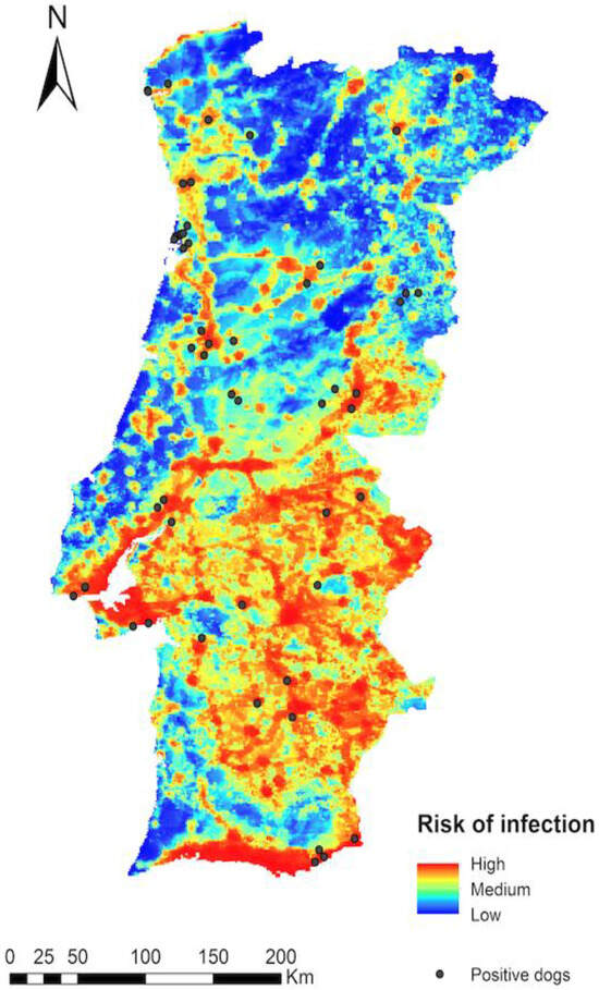 For the validation of the D. immitis risk map, we georeferenced points of D. immitis-infected dogs in all the districts of Portugal in the Iberian Peninsula and superimposed them onto the risk map to see in which area they inhabited. These maps were not available for the Azores and Madeira archipelagos due to a lack of information regarding the vectors.