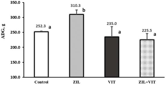 The figure shows the effect of zilpaterol and vitamin D3 on ADG of feedlot lambs. Values with different letters are significantly different (p ≤ 0.05).