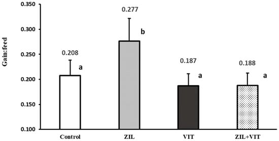 The figure shows the effect of zilpaterol and vitamin D3 on the feed efficiency of feedlot lambs. Values with different letters are significantly different (p ≤ 0.05).