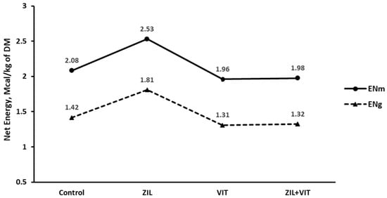 Table 3 outlines the main effects of the dietary energetics of feedlot lambs. During the trial, dietary energetics improved with the use of ZH supplementation, as determined by LW gain and DMI. ZH significantly improved dietary NEm and NEg by 11.3% and 14.7%, respectively (p < 0.01). These improvements are reflected in the observed/expected ratio for DMI, NEm, and NEg, which increased by 11.3%, 11.4%, and 14.7%, respectively (p ≤ 0.01). The inclusion of D3 in the diet of lambs for 7 d prior to slaughter had an adverse effect on the calculation of dietary energy derived from LW gain and DMI during the experiment. This resulted in a significant reduction (p < 0.01) in NEm and NEg by 14.7% and 18.6%, respectively. Additionally, there was a decrease (p < 0.01) of 20.0% in the efficiency of the observed/expected DMI ratio. All of the calculations used to estimate dietary energy from LW gain and DMI showed (Figure 3) a negative interaction response (p ≤ 0.02). Despite the positive response in terms of growth performance components, the addition of ZIL+VIT to the diet did not improve energy efficiency.