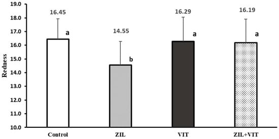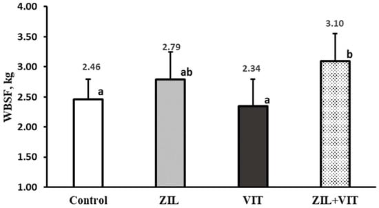 In Figure 5 and Figure 6, an interaction (p < 0.01) between the variables of redness intensity (a*) and meat pH with the combined supplementation of ZIL+VIT is observed. ZIL treatment had a negative effect (p < 0.01) on the intensity of redness, decreasing it by 11.5% compared to the control group. However, when combined with VIT, the redness intensity of lambs treated with ZIL+VIT improved by 11.2% compared with ZIL; however, there was no significant difference compared to other treatments. Similarly, ZH maintained high meat pH values (p < 0.01) concerning the control, ZIL, and VIT treatments, and when comparing ZIL to the control group, the pH was 5.3% higher. However, when supplementing ZIL+VIT, the final pH of the meat decreased by 4.6% when compared to lambs treated with ZIL alone. Finally, lambs treated with ZIL+VIT had a similar final pH to the control and VIT groups. Additionally, there was an interaction between ZIL and VIT in the muscle’s WBSF. Contrary to expectations, the ZIL+VIT treatment led to higher WBSF values than the control and VIT treatments, indicating an increase in meat toughness (Figure 7).