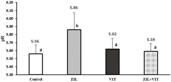 The figure shows the effect of treatments on the pH of longissimus dorsi of feedlot lambs. Values with different letters are significantly different (p ≤ 0.05).