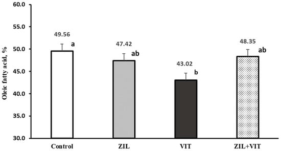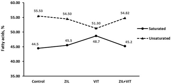An interaction response (p = 0.03) between ZIL and VIT was observed in the percentage of oleic fatty acid of intramuscular fat. Figure 8 shows that the treatment using VIT reduced the percentage of oleic fatty acid in intramuscular fat by 13.1% compared to the control group. However, this effect did not occur when supplemented with ZIL or ZIL+VIT. It was observed that there was an interaction trend (p = 0.09) with ZIL+VIT supplementation. Lambs who were supplemented with VIT experienced a decrease in unsaturated fatty acids and an increase in saturated fatty acids, as shown in Figure 9. However, these effects were not observed in the samples analyzed from lambs who were supplemented with ZIL+VIT.