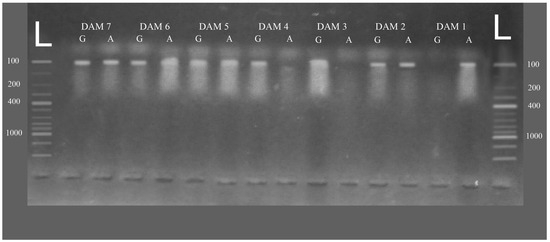L = 100 bp ladder, Dam 1 = homozygous AA, Dam 2 = heterozygous AG, Dam 3 = homozygous GG, Dam 4 = homozygous GG, Dam 5, 6 and 7 = heterozygous AG respectively.