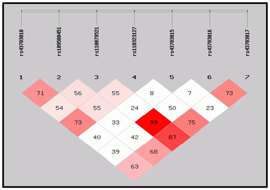 LD of CSN haplotypes and linkage disequilibrium. Pairwise linkage disequilibrium (LD) values (D′) and the haplotype blocks for the seven SNPs on the casein gene. The values within boxes are the pairwise SNP correlation (D′); bright red boxes without numbers indicate complete LD (D′ = 1). The brighter shade of red indicates higher LD.