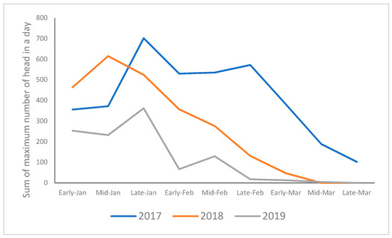 On the other hand, the number of SSLs was counted every hour from January to March in 2017, 2018, and 2019, with the peak occurring in late January (Figure 1). The maximum number of SSLs per day peaked in late January in 2017 and 2019, but in 2018, it peaked in mid-January. Although the number of SSLs was lower in January 2017 than in 2018, the peak in late January was the highest in the three years analyzed, and this maximum number remained until late February and began to decrease in March. The maximum number of SSLs in 2018 per day was higher than in any other year. However, it fell in February and the SSLs were almost absent in March. In 2019, the number of SSLs was the lowest in the three years analyzed, and after the peak in late January, the number rapidly decreased; from late February onwards, they were rarely seen.