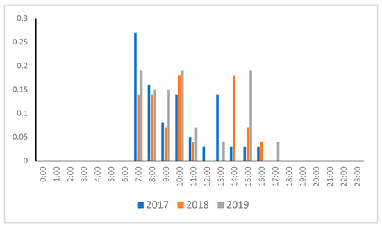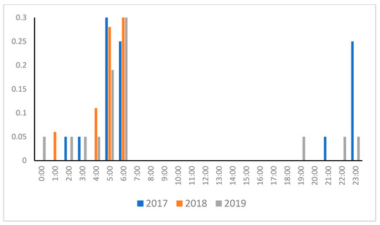 As shown in Figure 2, the SSLs hauled out from 7:00 to 17:00. No differences were seen in the three years analyzed (p = 0.454). Next, as shown in Figure 3, the water entrance start times were mainly concentrated in the morning, with a peak observed between 5:00 and 6:00. In 2017, the SSLs frequently entered the water at 23:00. However, when compared over the three years analyzed, no significant difference was observed (p = 0.266). Additionally, entry into the water did not occur between 7:00 and 18:00.