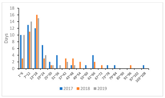 We tallied the time during which the SSLs continuously remained on the haulout, divided it into 6 h intervals, and created a histogram based on the number of days (Figure 4). As a result, the residence time on the haulout peaked at 7–12 h in 2017, but the longest time was 104 h on 3–4 March. In 2018, the peak time was 13–18 h, and the maximum residence time was 94 h from 11 to 14 February, a slight decrease compared to the previous year. In 2019, the peak time was 13–18 h, similar to the previous year, but the maximum residence time was 48 h from 5 to 7 January, less than half of that. Each year, there were days when the usage time exceeded 24 h, but the maximum length of the stay decreased from 2017 to 2019. However, no significant difference in the length of the stay on the haulout over the three years was found (p = 0.0874, Kruskal–Wallis test).