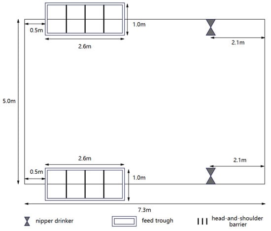 The dimensions of the pen on the farm were 7.3 m × 5.0 m, providing an average usable area of 1.22 m2 per pig, exceeding the minimum movement area requirement of 1.0 m2 for a 110 kg pig. Installation of ventilation devices, such as exhaust fans, effectively mitigates the adverse effects of high humidity, condensation, and unexpected wind on the pigs. Pen temperature is maintained between 18 and 22 degrees Celsius to meet the environmental requirements for fattening pigs. Each pen is equipped with two nipple drinking fountains for free water access, meeting the standards of GB5749-2022 [24]. Automatic supply of dry feed is facilitated through two feed troughs, each featuring four feeding spaces. A head-and-shoulder barrier between each feeding space enables simultaneous accommodation of multiple pigs. The structure of the pen is shown in Figure 1.
