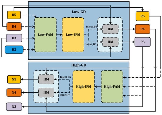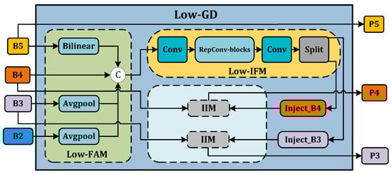 - Low-GD. The Low-GD component is structured to encompass Low-FAM, Low-IFM, and IIM. Figure 5 provides a detailed representation of this layout. B2, B3, B4, and B5 feature maps from the backbone output are chosen as input for Low-IFM, with B4 determining the target feature size. After feature alignment, the combined feature is derived, which is then inputted into Low-IFM and run through a Repblock. This generates the global features and . and are combined with these in IIM, yielding and . Simultaneously, is retained as . Ultimately, the output features of Low-GD are produced in this manner.
