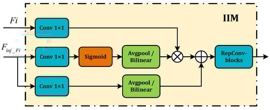 - IIM. IIM fuses the split global information from the IFM output with the input information from the corresponding scale in FAM. This compound is injected into the network model to ensure the efficient distribution of global context information through a self-attention approach. As shown in Figure 4, the inputs are the features of the current scale () and the global features derived from the IFM output (). Here, i is an integer ranging from 3 to 5, representing various levels. Two types of Convs are used with , yielding and , respectively, and is calculated using a Conv of . Should there be any inconsistency in size during the fusion process, it is rectified using average pooling or bilinear interpolation. We then compute and , considering attention to generate the fused feature . The resultant information undergoes further screening and merging via RepBlock processing, producing the output feature . The corresponding equations used in this process are as follows: