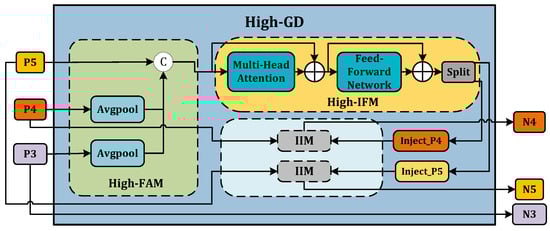 Distinct patterns emerge at different scales while recognizing pig behavior. Conventional models, such as the Feature Pyramid Network (FPN), are often reliant on predefined structures to manage features on multiple scales. Some models in the YOLO series incorporate the FPN for enhanced feature extraction. However, these methods may encounter information loss during the fusion of features, particularly when assimilating data generated at various scales by pigs of different sizes and postures. Our proposed solution involves an innovative GD mechanism. This strategy, an extension of the TopFormer’s concept [28], globally integrates features from multiple levels and incorporates this comprehensive information into more complex levels. This GD mechanism makes information exchange at different levels and scales more efficient. The fusion modules for global and local features enable superior capture and communication of contextual information from pig behavior. The GD mechanism mitigates information loss during transmission, thereby enhancing the traditional FPN structure. Figure 3 illustrates the general structure of the GD mechanism. In this depiction, , and signify the feature maps extracted by the backbone, serving as inputs to the neck. More specifically, , where N represents the batch size, C denotes the number of channels, and the spatial dimensions are expressed by . Moreover, the dimensions of and are correspondingly , and .