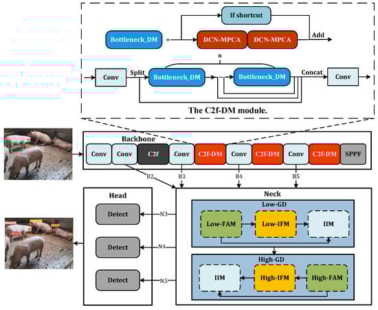 On a different note, in YOLOv8, PAN and FPN can only indirectly fuse non-adjacent feature layer information, leading to slow fusion speed and incomplete fusion of behavioral feature information. To address this, the GD mechanism is activated in the neck, allowing for complete fusion and exchange of behavioral feature information. Therefore, we propose a model DM-GD-YOLO for pig behavior recognition, based on the YOLOv8 framework that integrates attention-enhanced deformable convolution and the GD mechanism. The structure of DM-GD-YOLO is illustrated in Figure 7.