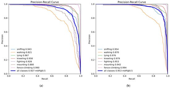 The precision–recall (P–R) curves for YOLOv8 and the proposed DM-GD-YOLO were plotted with precision and recall on the x-axis and y-axis, respectively, as shown in Figure 8. The area under the P–R curve indicates the AP, where a larger area signifies higher AP values. The Figure illustrates varied improvements in AP across different behaviors. Notable behavior classifications with minor AP changes include sniffing and lying. The abnormal behavior of fence-climbing, already achieving a peak AP of 99% in the baseline model, shows marginal enhancement. In contrast, significant AP disparities are observed in climbing and walking behaviors, with a notable increase of 6.2% and 4.9%,, respectively. Particularly noteworthy is the behavior of climbing, which originally yielded an mAP of 88% but rose to 94.2% with DM-GD-YOLO. Furthermore, fighting behavior experienced a 2.5% enhancement. These improvements can be attributed to C2f-DM’s role in enhancing data extraction for behavior recognition, alongside the GD mechanism’s contribution to integrating behavioral information efficiently, thus reducing valuable information loss. This results in superior performance in recognizing complex abnormal behaviors. The proposed DM-GD-YOLO outperforms YOLOv8 by 2.6% in mAP, affirming its effectiveness in improving pig behavior recognition accuracy and notably excelling in recognizing abnormal behaviors.