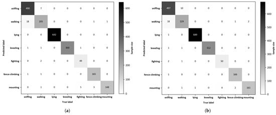 The two-dimensional confusion matrix visually compares predicted outcomes against actual results to evaluate the effectiveness of behavior recognition models. The confusion matrices depicting the recognition outcomes of the YOLOv8 and DM-GD-YOLO on the test dataset are presented in Figure 9, respectively. In the comparison between YOLOv8 and DM-GD-YOLO, the latter exhibited superior accuracy in recognizing all seven behaviors. Specifically, DM-GD-YOLO correctly recognized sniffing, walking, lying, kneeling, fighting, fence-climbing, and mounting with an additional 7, 24, 47, 12, 1, 1, and 13 instances, respectively. Notably, the enhancements in the recognition of walking and mounting behaviors by DM-GD-YOLO align with the findings from the P–R curve analysis, while the accurate recognition of fence climbing is already high in the baseline model, DM-GD-YOLO maintains a similar performance level with a slight increase.