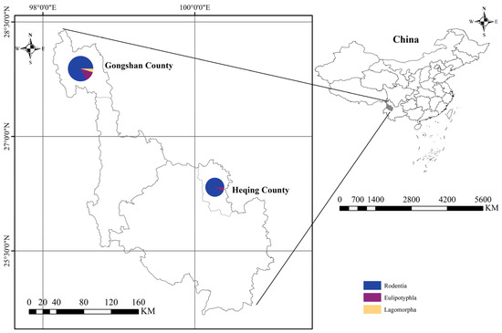Small mammal samples were collected using live rat traps (20 × 12 × 10.5 cm3, Xiangyun Hong Jin Mouse Cage factory, Dali, China) baited with freshly deep-fried dough sticks in Heqing County and Gongshan County in Yunnan Province from August 2020 to August 2022. A total of 200 cages were set every five meters during the evening and collected in the morning, with this process repeated for approximately 6 days in each habitat. Small animals were gently anesthetized in an induction chamber filled with cotton infused with isoflurane (1 mL of isoflurane per 500 mL of chamber volume). Isoflurane is an anaesthetic drug prescribed by the Medical Ethics Committee of Dali University and its main advantage is that it allows the animal to be under anaesthesia with less pain. Following anesthesia, animals were compassionately sacrificed on a warming blanket to minimize distress. Dissections were performed to extract heart, liver, spleen, lung, kidney, brain, and intestinal tissues. These tissues were stored in 2 mL cryogenic vials (CORNING, Shanghai, China) at −80 °C for subsequent analysis. Molecular biological identification involved the amplification of the mitochondrial cytochrome b (mt-Cytb) gene of liver tissue DNA using PCR as described previously [24,25,26,27]. A total of 333 small mammals, comprising thirteen species across three orders, four families, and four genera, were captured in Heqing County and Gongshan County in Yunnan Province (Figure 1).