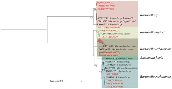 In the phylogenetic tree constructed based on the ssrA gene, the 30 sequences are classified Bartonella, forming four distinct categories. The first branch comprises HQ92, HQ38, HQ76, and the six folded sequences (HQ66, HQ72, HQ73, HQ77, HQ96, and HQ99) in unclassified Bartonella spp. The second branch comprises GS183, GS167, and GS55 in B. taylorii. The third branch comprises GS164, HQ9, and twelve folded sequences (HQ4, HQ18, HQ25, HQ32, HQ34, HQ35, HQ55, HQ80, GS29, GS35, GS37, GS60) in B. tribocorum. The fourth branch consists of GS39, GS40, GS43, and GS97 in B. rochalimae (Figure 2).
