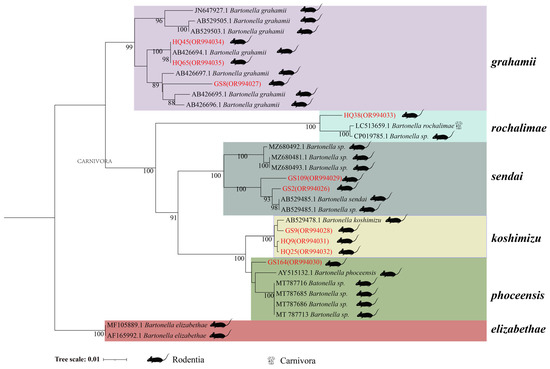 The DNA sequences were assembled using the DNAstar Lasergene software package version 7.1.0, employing manual editing and precision trimming to generate the definitive Bartonella genome sequence. Subsequently, a thorough similarity analysis was conducted using the BLAST. The representative reference sequences for the gltA, rpoB, and ssrA genes were obtained from the NCBI GenBank database. Sequence alignment was performed using ClustalX2, followed by DNA sequence analysis utilizing the maximum likelihood method in MEGAX 11.0 [32]. The Kimura two-parameter method was employed for phylogenetic analysis. Typically, a self-similarity value greater than 70% is considered a reliable indicator of evolutionary branching. The results were visualized in iTOL (https://itol.embl.de/, accessed on 14 January 2024). The present study utilized all sequences obtained from the three genes of ssrA, gltA, and rpoB in GeneBank (accession numbers: OR993996–OR994040).
