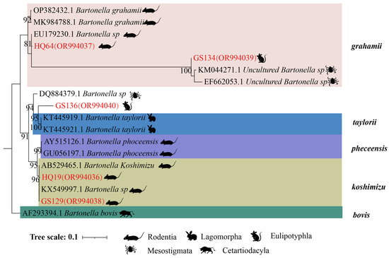 The ssrA gene, along with the gltA and rpoB genes, possesses identical species identification functions [29]. The ssrA can also be employed for the swift detection and classification of Bartonella. According to the DNA sequences determined by gltA, rpoB, and ssrA genes, at least seven species of Bartonella were detected in these small mammals through homology and phylogenetic analysis. These include B. grahamii, B. rochalimae, B. sendai, B. koshimizu, B. phoceensis, B. taylorii, B. koshimizu, and a newly isolated Bartonella (GS136: the highest similarity of only 92.1% with uncultured Bartonella spp.) that should be considered a new species based on the gltA fragment of 327 bp having 96.0% sequence similarity to the validated species or the rpoB fragment of 825 bp having 95.4% similarity to the sequence of the evidenced species [40]. In addition, B. grahamii, originally isolated from the bank vole (Myodes glareolus) in the UK and subsequently linked to retinitis and cat-scratch disease (CDS) [2,41,42,43], can infect humans. These results indicate the presence of diverse Bartonella species among small mammals in the survey areas that can cause human disease.