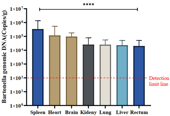 Tissue distribution of Bartonella species in positive samples. The quantification (mean ± standard error) of Bartonella species in the spleen, heart, brain, kidney, lung, liver, and rectum of 30 positive samples was measured in copies/g. The significance test was performed using one-way ANOVA (**** p < 0.0001). The detection limit of qPCR is indicated by a red dashed line in this study.