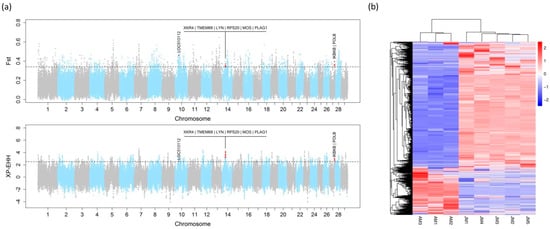 FST and XP-EHH were used to identify the candidate signatures of positive selection in Angus cattle. The procedures for calculating the FST and XP-EHH values have been previously described []. In brief, FST analysis was calculated in 20 kb steps in a 50 kb window using VCFtools []. XP-EHH statistics based on extended haplotypes were calculated using selscan v1.1 []. A positive XP-EHH score suggested that selection was likely to have happened in Angus cattle. The overlaps between each method’s top 1% genomic regions were considered candidate signatures of positive selection in Angus cattle. In addition, the overlaps were checked between these identified regions and known growth-related QTLs available in the Animal QTL Database (Animal QTLdb, release 40) []. These overlaps were considered as the candidate regions for cattle growth.
