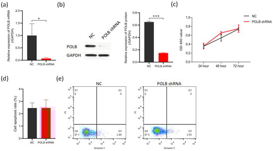 Knockdown of POLB gene does not inhibit apoptosis in bovine primary myocytes. (a) RT-PCR analysis of the efficiency of inhibition of POLB in bovine primary myoblasts. (b) Western blot and RT-PCR analysis of the protein expression levels of inhibition of the POLB gene. (c) Cell viability of bovine primary myoblasts was detected by CCK-8 assay, while POLB was inhibited 24 h later. (d,e) RT-PCR and flow cytometry analysis of the effects of inhibition of the POLB gene on apoptosis. The data are presented as means ± standard deviation. * p < 0.05 and *** p < 0.001.