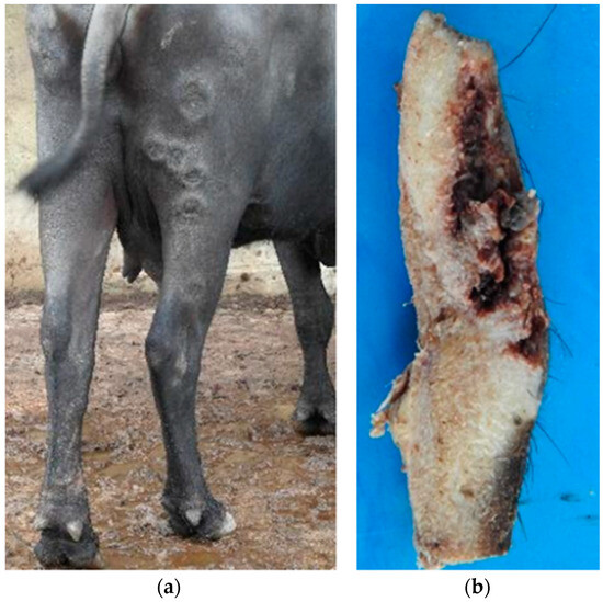 On clinical examination, in the initial phase, the skin lesions (Buffalo 1 and 4) were characterized by rounded areas with dry and depressed central regions, sensitive to palpation, with protruding and irregular borders and a diameter ranging from 8 cm to 15 cm. These areas of necrosis were sometimes isolated and sometimes coalesced and distributed mainly on the limbs and sides (Figure 1 and Figure 2a).