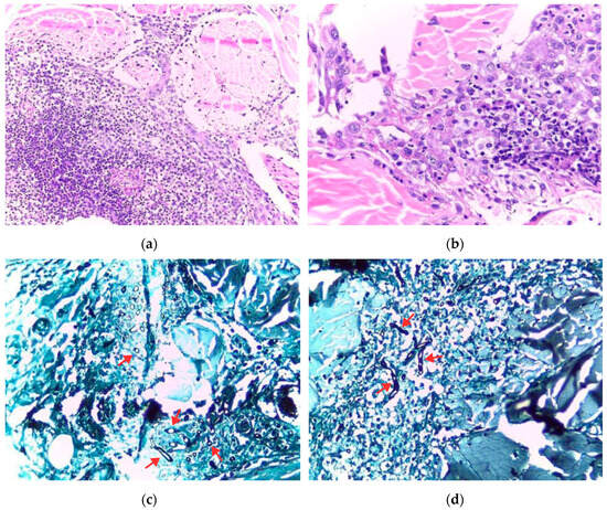 A histological examination of the skin (Buffalo 1) showed the marked multifocal-to-coalescing inflammatory infiltrate of intact and degenerated neutrophils, macrophages, epithelioid macrophages, lymphocytes, and plasma cells. Additionally, there were vasculitis, occasional thrombosis, and transverse and longitudinal sections of fungal hyphae, in addition to the hypertrophy of the vascular wall. In the center of these areas, there were fibers of intensely amorphous eosinophilic material. There was also a focally extensive area of epidermal ulceration characterized by intact and degenerated neutrophils, the necrosis of epithelial cells, and the accumulation of fibrin and erythrocytes (Figure 3a,b). GMS staining of the skin highlighted hyphae, which were tubular, irregular in diameter, and thick, with dichotomous branching and an unstained interior (Figure 3c,d). In addition, the mycological culture was positive for Rhizopus sp.