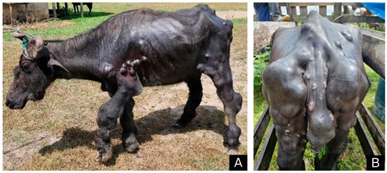 A seven-year-old female buffalo of the Murrah breed, weighing approximately 400 kg, was under observation in a property located in the municipality of Santa Cruz, Marajó Island, Pará (−0.894922936378, −49.0738353788). According to the caretakers, over the previous two years, the animal had gradually lost weight and multiple nodules of varying sizes had appeared over its body. In view of the animal’s clinical presentation, the owner requested a technical visit to the property.