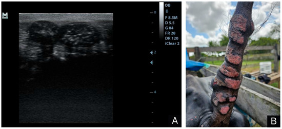 Parasitic granulomatous dermatitis caused by Pelodera spp. in buffalo; (A) ultrasound image of skin nodules characterized by ovoid structures located in the subcutaneous tissue, with a multifocal and sometimes coalescent distribution delimited by a capsule. Sometimes, these nodules were thicker and sometimes they were delimited by a thin hyperechoic line, with heterogeneous contents in echogenic areas and hypoechogenic liquid content tending to anechoic in shapeless hyperechoic areas. (B) Ulcerated, well-delimited, multifocal to coalescing skin lesions with irregular borders and of varying sizes distributed along the ventral region of the tail.