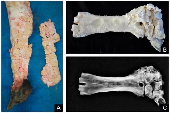 On the nasal mucosa the lesions were projected into the lumen and partially obstructed the nasal cavity. When cut, the masses were well delimited, soft and yellowish; had a necrotic and caseous center; and were surrounded by a whitish and firm capsule (Figure 3A). After the necropsy, the metacarpals, carpals, metatarsals, tarsals, radius and ulna of the right hindlimb were macerated, and rough-to-irregular osteophytes and concavities/depressions on the diaphysis of the metacarpals were observed on the surface of these bones. X-rays showed periosteal reactions, joint space narrowing and osteolysis, with osteophytes and enthesophytes (Figure 3B,C). Samples were collected from several organs and fixed in 10% formalin for subsequent histological analysis and stained with hematoxylin and eosin. In addition, samples of the skin and lymph nodes were stained with Grocott methenamine silver and Ziehl–Neelsen stain.