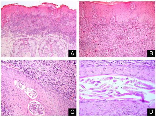 Parasitic granulomatous dermatitis caused by Pelodera spp. in buffalo: (A) Inflammatory infiltrate in the superficial dermis, absence of hair follicles and evident acanthosis and epidermal hyperkeratosis. HE, 40×. (B) Inflammatory infiltrate rich in multinucleated giant cells in the dermis. HE, 100×. (C) Granulomatous inflammation around a hair follicle full of parasitic structures. HE, 200×. (D) Several sections of rhabditiform parasites inside the hair follicle. HE, 400×.