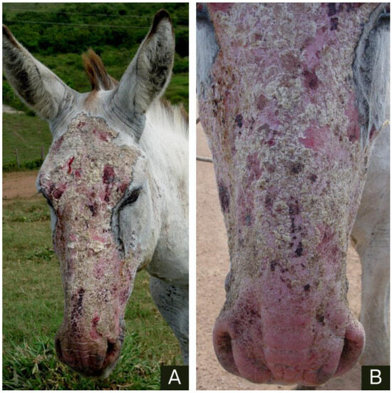 All animals included were raised in an extensive system of Urochloa humidicola and Panicum maximum “Mombaça”. Water originated from streams and/or lakes located in pastures. On all farms, donkeys coexisted with horses and showed no signs of injury. However, on farm 4, goats and sheep showed similar skin symptoms, suggesting that allergic dermatitis may be associated with insect bites. During the period of the highest rainfall, all farms consistently experienced water accumulation (puddles) in pastures and around management facilities. Animal caretakers from farms 3 and 4 reported that the lesions healed when the affected donkeys were relocated to other places (neighboring farms) or confined in stables and treated using methods adopted by the owners, such as baths combined with using pour-on or sheep fat (a homemade cream made from sheep fat extraction). However, skin problems re-emerged when the animals returned to their previous environments.