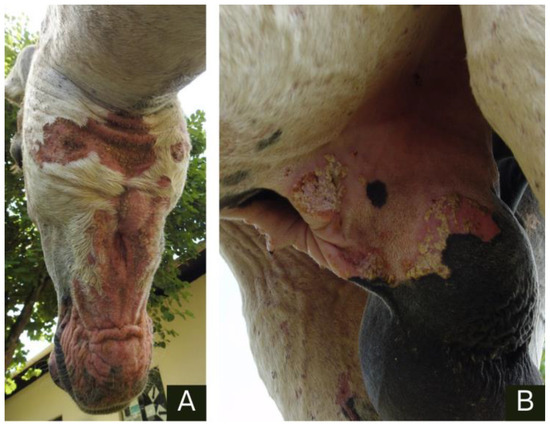 Donkey 5, an adult male Pêga breed, suffers from allergic dermatitis due to Culicoides spp. bites. (A) Alopecic, hyperemic, and thickened skin on the cheek. (B) Scrotal skin with hyperemia and crusts.
