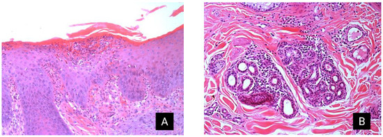 Allergic dermatitis in Pêga donkeys. (A) Haired skin, focal area of intraepidermal pustule filled with moderated intact and degenerated neutrophils, and swollen keratinocytes with vacuolated cytoplasm (edema). This pustule is covered by moderate keratin, cellular debris, and rare erythrocytes (crust). Multifocally, on the superficial dermis, there are moderate numbers of neutrophils, lymphocytes, plasma cells, and eosinophils. Furthermore, severe diffuse irregular acanthosis and moderate diffuse orthokeratotic hyperkeratosis are observed in the epidermis. Using H&E staining. (B) Haired skin: multifocally in the mid-dermis and surrounding adnexa, there is severe inflammatory infiltration of lymphocytes, plasma cells, neutrophils, and eosinophils. H&E, hematoxylin and eosin.