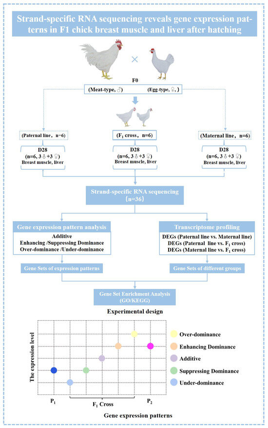 As described previously, one male meat-type chicken (Recessive White chicken) and a female egg-type chicken (Lohmann pink layer) were used to establish a full-sib F1 population [24]. Based on previous studies on growth rate and transcriptome sequencing data, we observed a significant turning point and differences in the growth rate phenotype and number of differentially expressed genes of the hybrid F1 population at 28 days compared to other time points [26]. Therefore, ssRNA-seq data from day 28 breast muscle and liver samples of the parental lines and the F1 cross were further used to explore the gene expression patterns (Figure 1). All birds were raised under the same ambient conditions with free access to feed and water. At the age of 28 days, we randomly selected 6 birds in the paternal line, maternal line, and F1 cross to collect breast muscle and liver tissues. All samples were immediately frozen in liquid nitrogen and stored at −80 °C until RNA extraction.